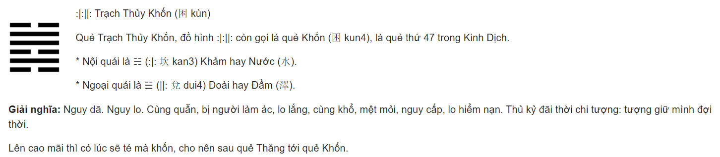 13h30 là giờ Quý Mùi, quẻ Kinh Dịch của giờ đó là Thủy Trạch Khốn, tượng trưng cho sự khốn cùng, hiểm nạn, lên cao mãi thì có lúc sẽ té mà khốn, cho nên sau quẻ Thăng tới quẻ Khốn. Dĩ nhiên gặp quẻ Khốn chắc chắn là lành ít dữ nhiều !